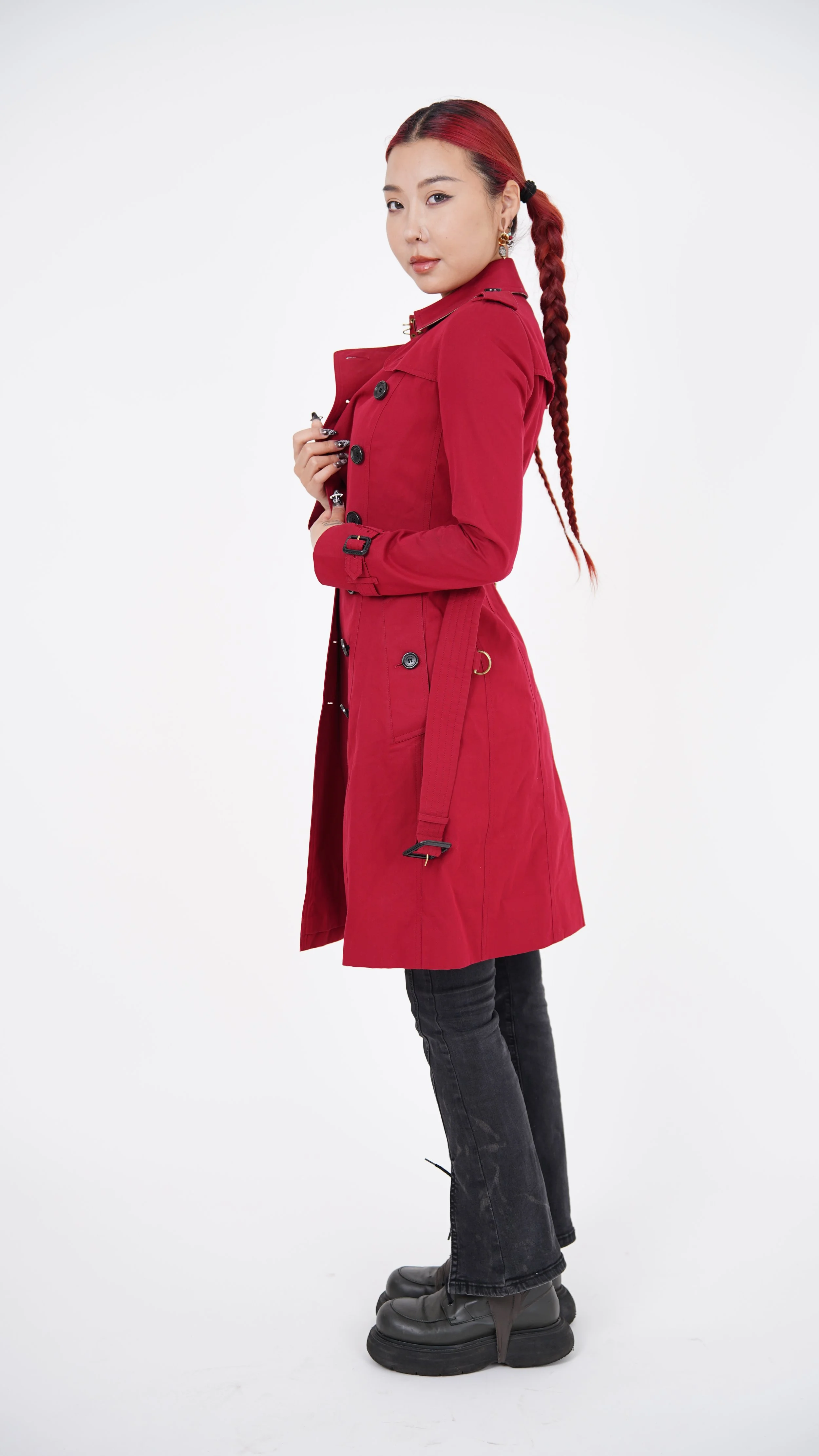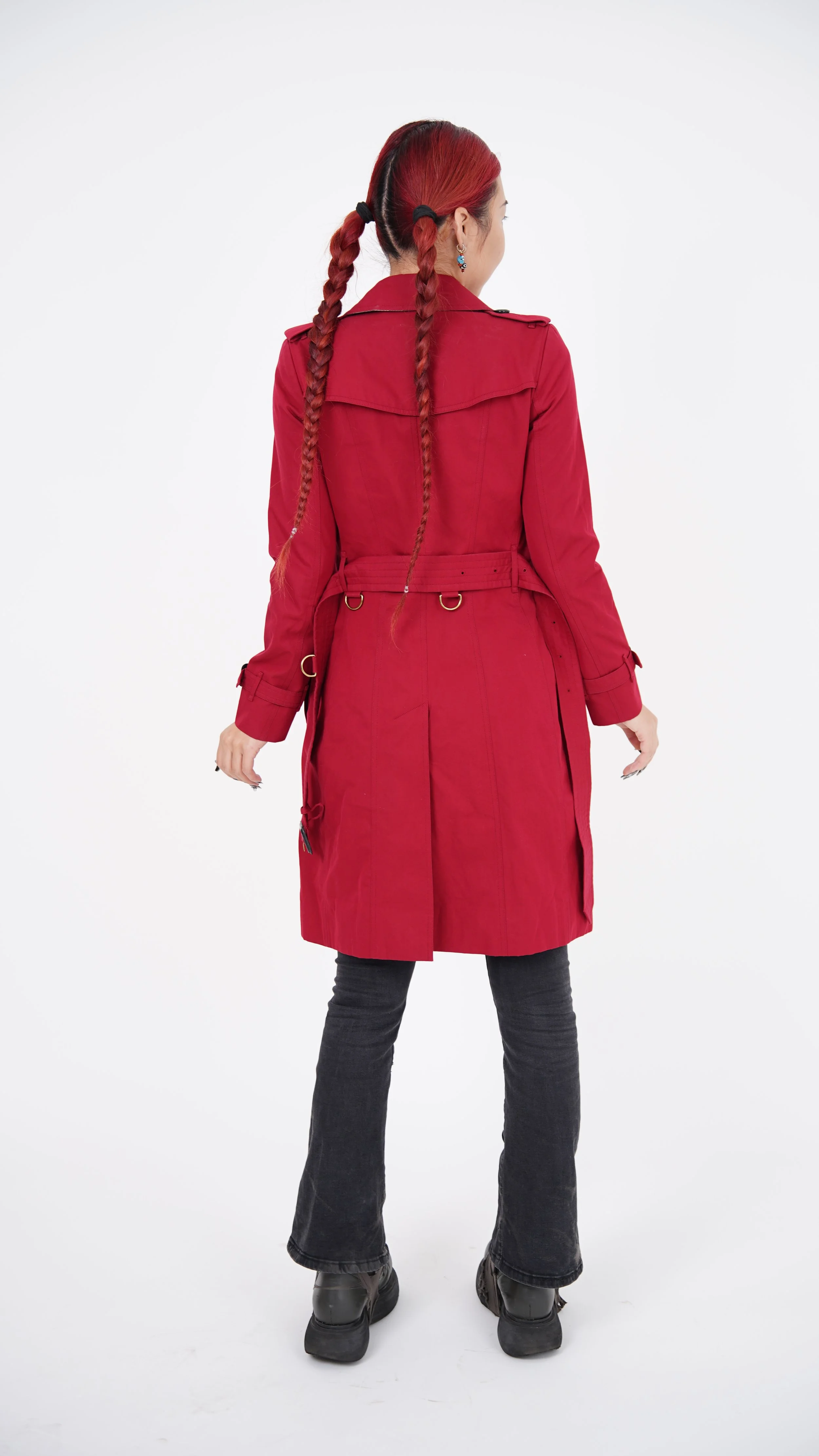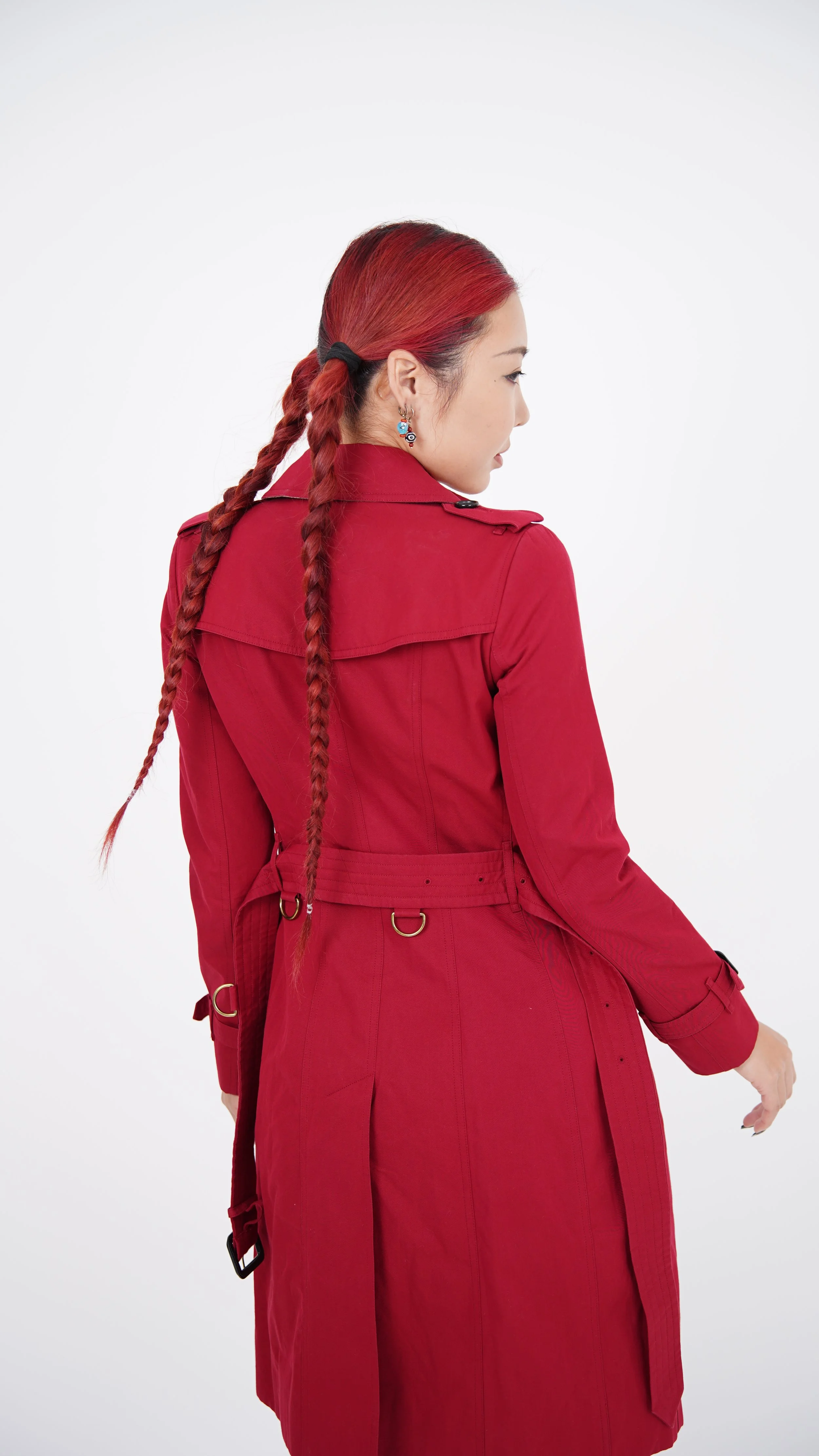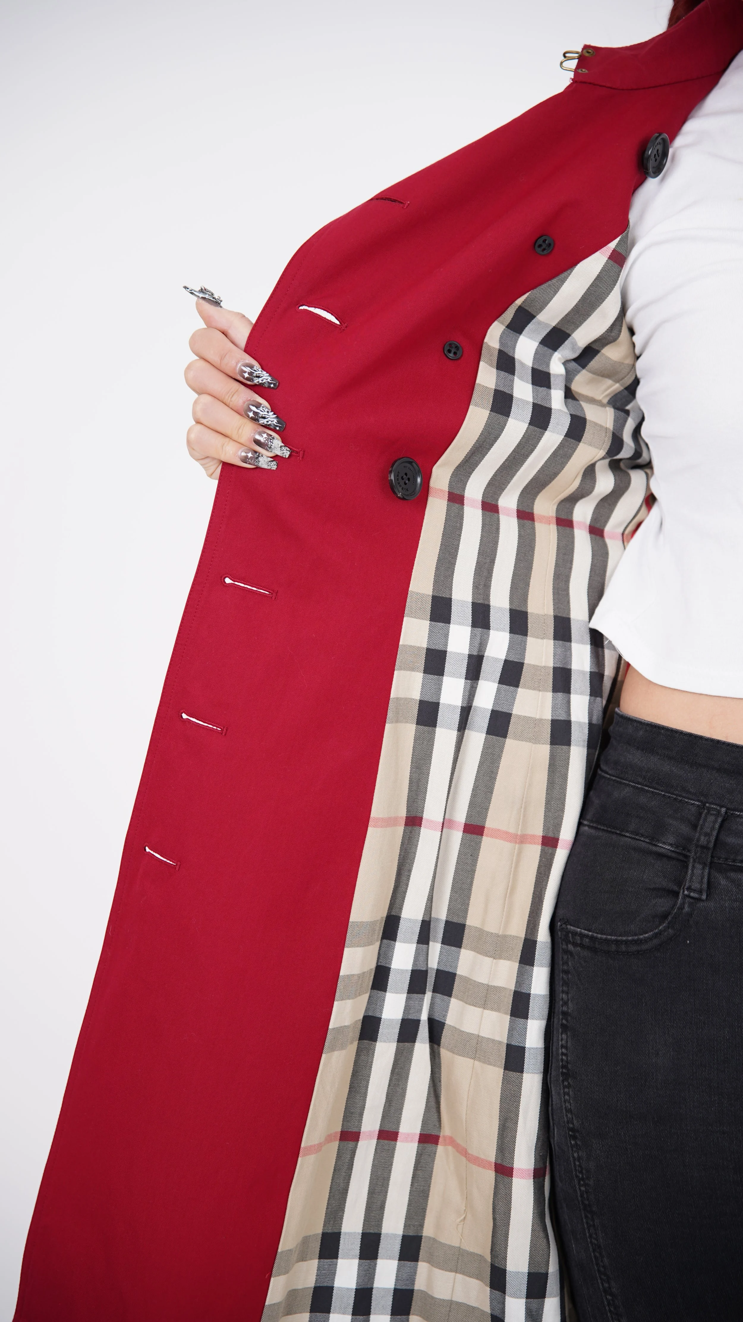 Statement Burberry wool coat in a striking vibrant red hue. This bold piece features a structured silhouette with sculpted shoulders, a high collar, and a unique cropped front panel with decorative buttons and flap pockets. Crafted from luxurious, heavyweight wool, it offers exceptional warmth and timeless elegance. The design balances classic Burberry craftsmanship with a modern, sculptural twist — perfect for standing out in any crowd. Ideal for festive occasions, evening outings, or city strolls when you want to make a statement.